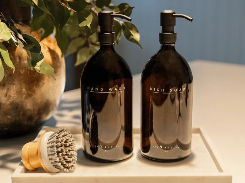 Amber Glass bottles, Dish Soap 32 oz + Hand Wash 32 oz — Elegant Matte Black Dispenser, Refillable Luxury Kitchen Soap Bottle | the Lavé co.