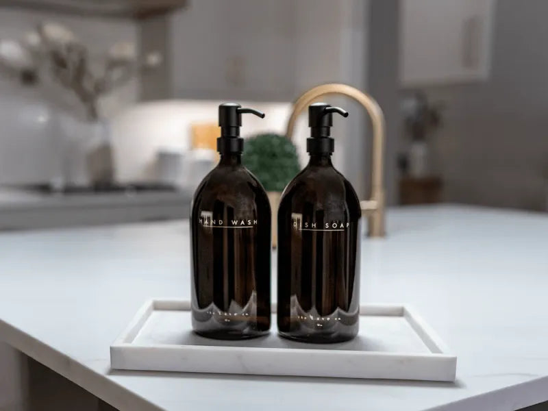 This 32 oz amber glass bottle set (Dish Soap + Hand Wash) by the Lavé co. brings warmth, sophistication, and function to your kitchen. Each vessel is thoughtfully crafted to elevate your countertop with subtle luxury — designed to be refilled, reused, and cherished for years to come.
